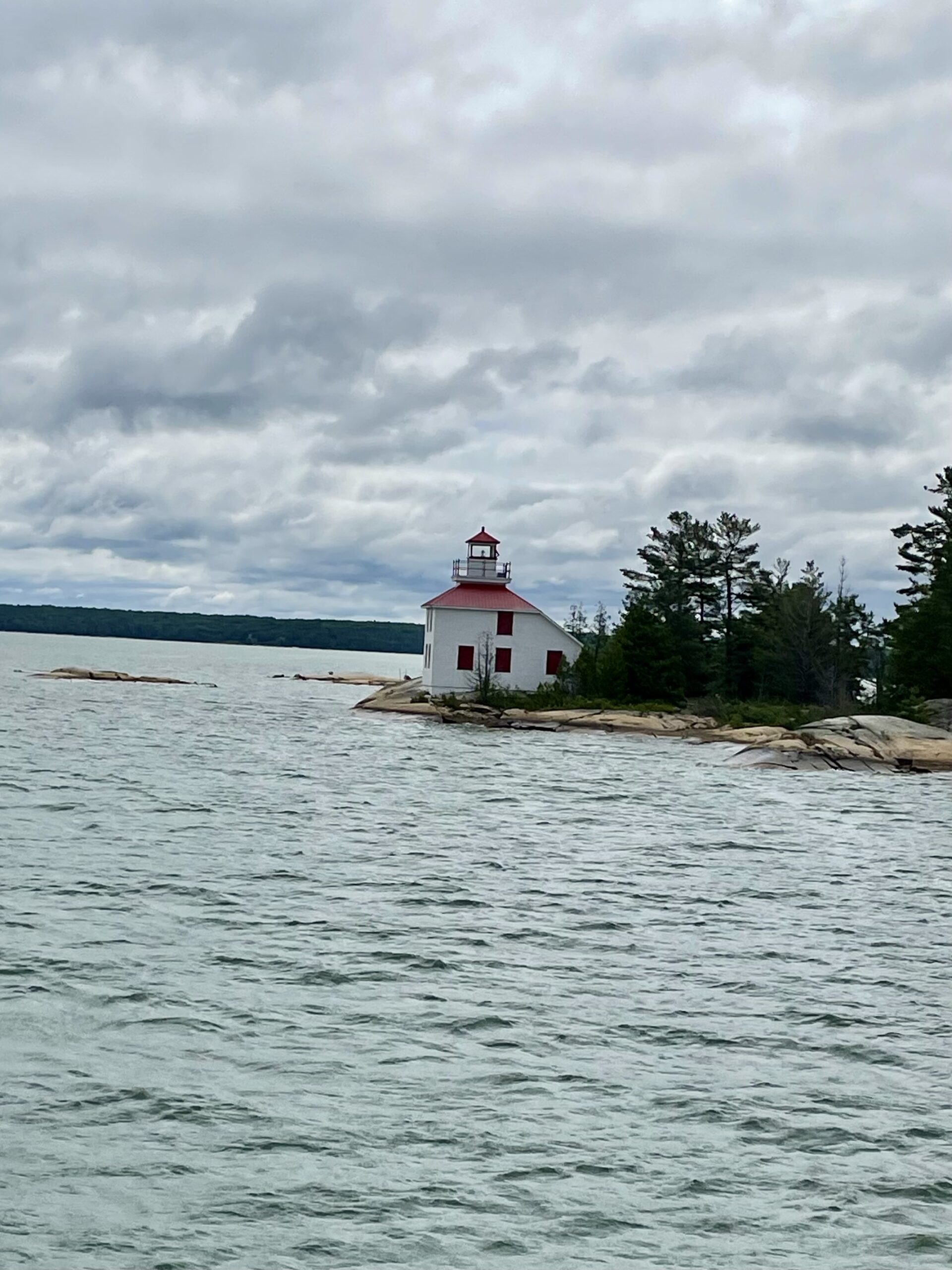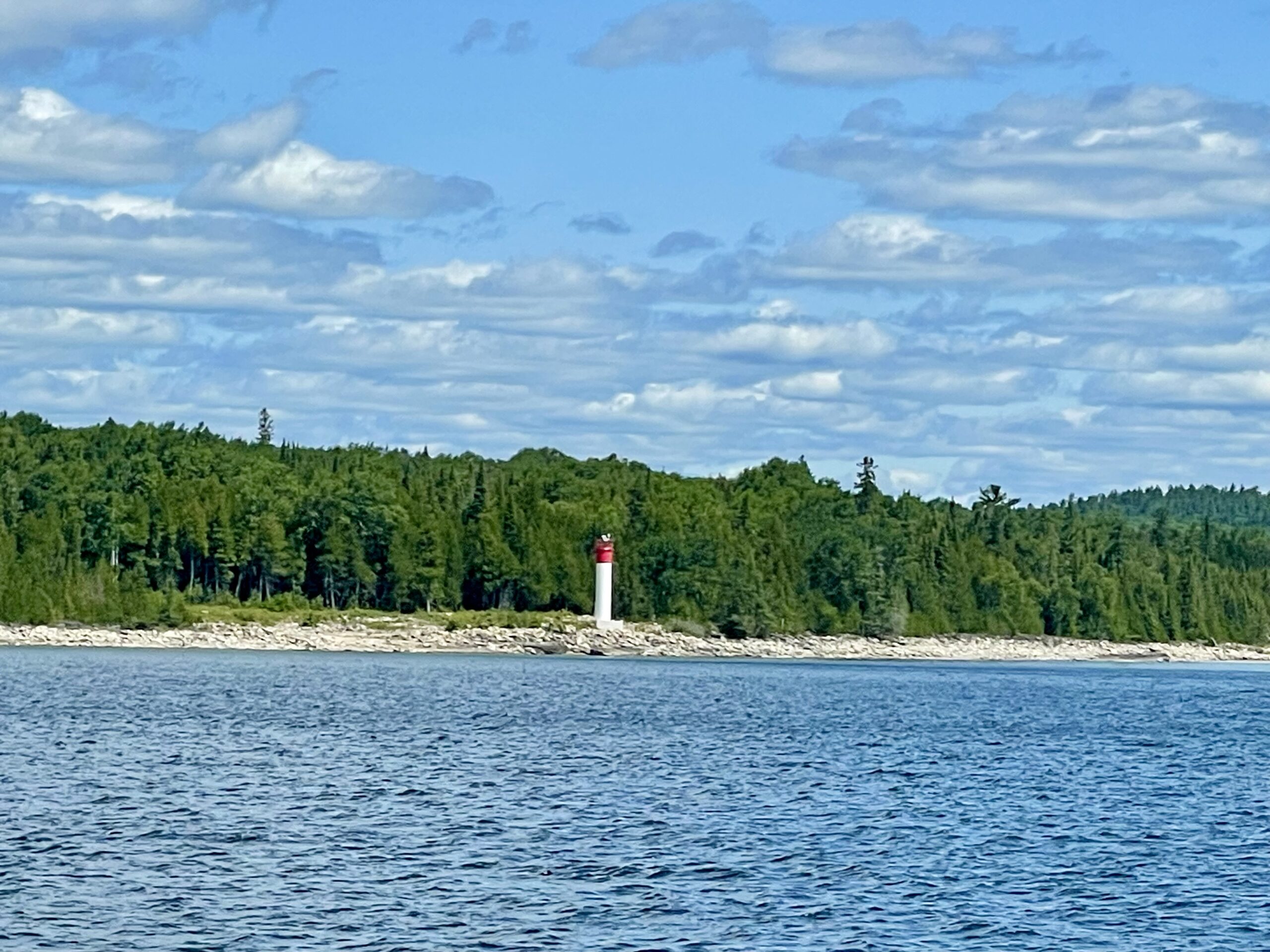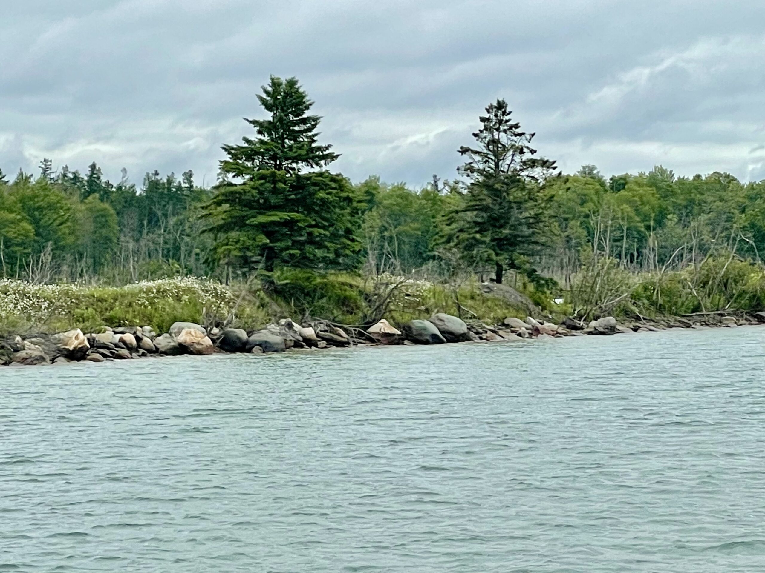 We left Sault Ste. Marie in a drizzle and haze about 9 and headed down the St. Mary’s River and turned east before we would cruise through the down bound channel narrow cut the Coast Guard made sure we missed on our way up. We navigated between a few islands and the terrain changed. Heavenly. The sun came out. We were back amongst the granite rock, the cypress and pine trees, and the feeling of oh – so Canada. It’s hard to describe the quaintness, the landscape, and the feeing of the North Channel. Thousands of granite islands with hues of pink, caramel, gray, and white, the beautifully waterline of cypress and pines with varying shades of green, deep blue-green water, fresh crisp air, and a sweet serenity. Like most of our trip, we were alone on the water, and this day it was perfect.