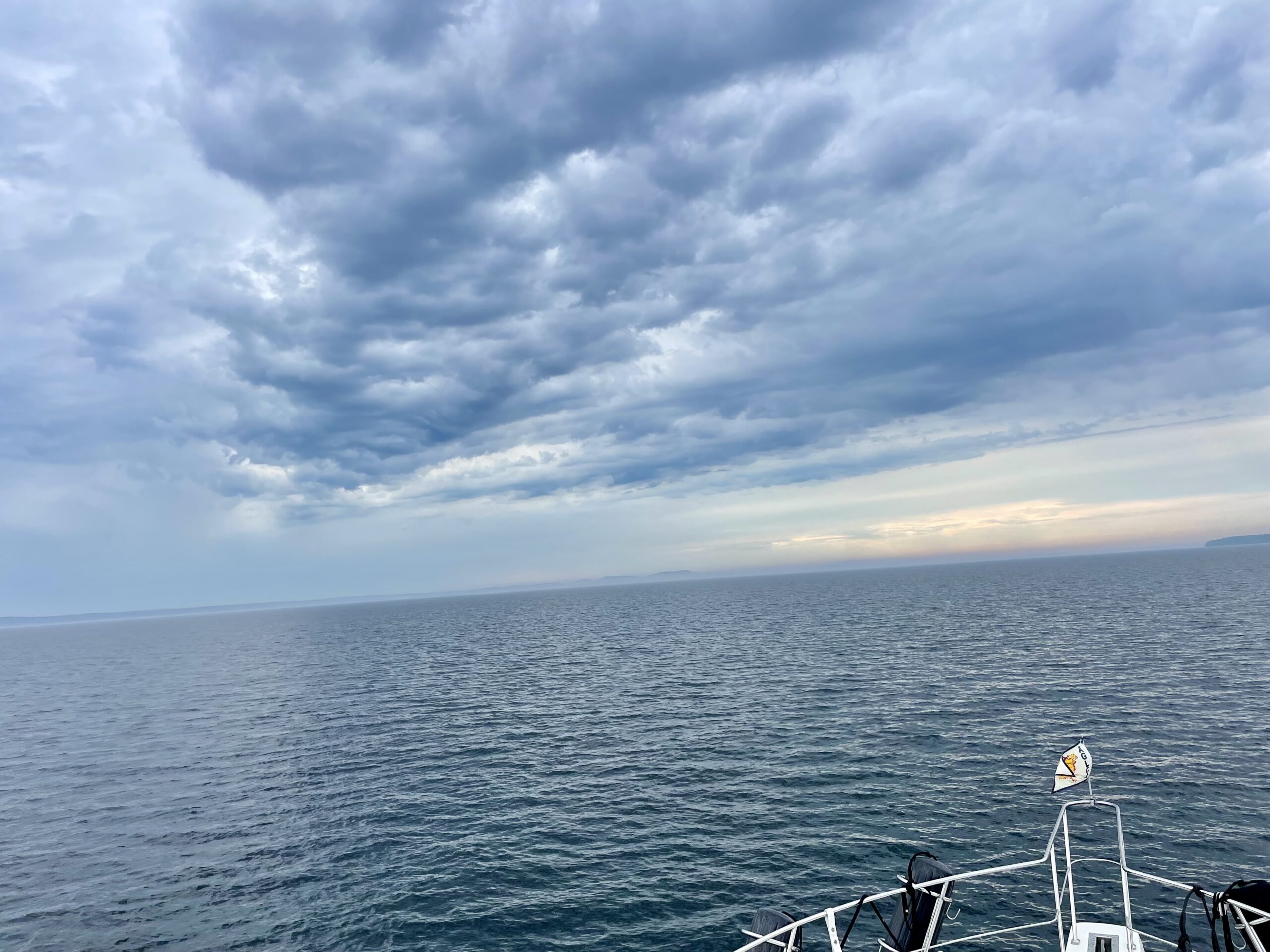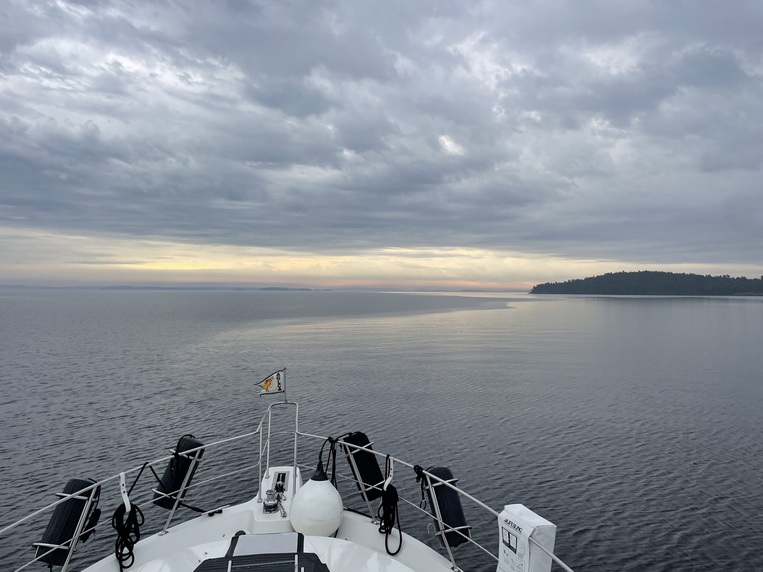 We cruised 33 miles to our destination for the night, Hilton Beach on St. Joe Island. Upon arrival, our captain completed the easiest of our four Canadian check in’s by far. A phone call and only a few questions included names, length of stay, weapons, drugs, alcohol and cannabis, anything to declare, cannabis, and cannabis a third time. Possessing no cannabis, we were cleared and switched the yellow quarantine flag for the Canadian courtesy flag. We will fly the courtesy flag on our starboard antenna mast while our American flag will fly from the stern per protocol until we return to the USA in about a month.