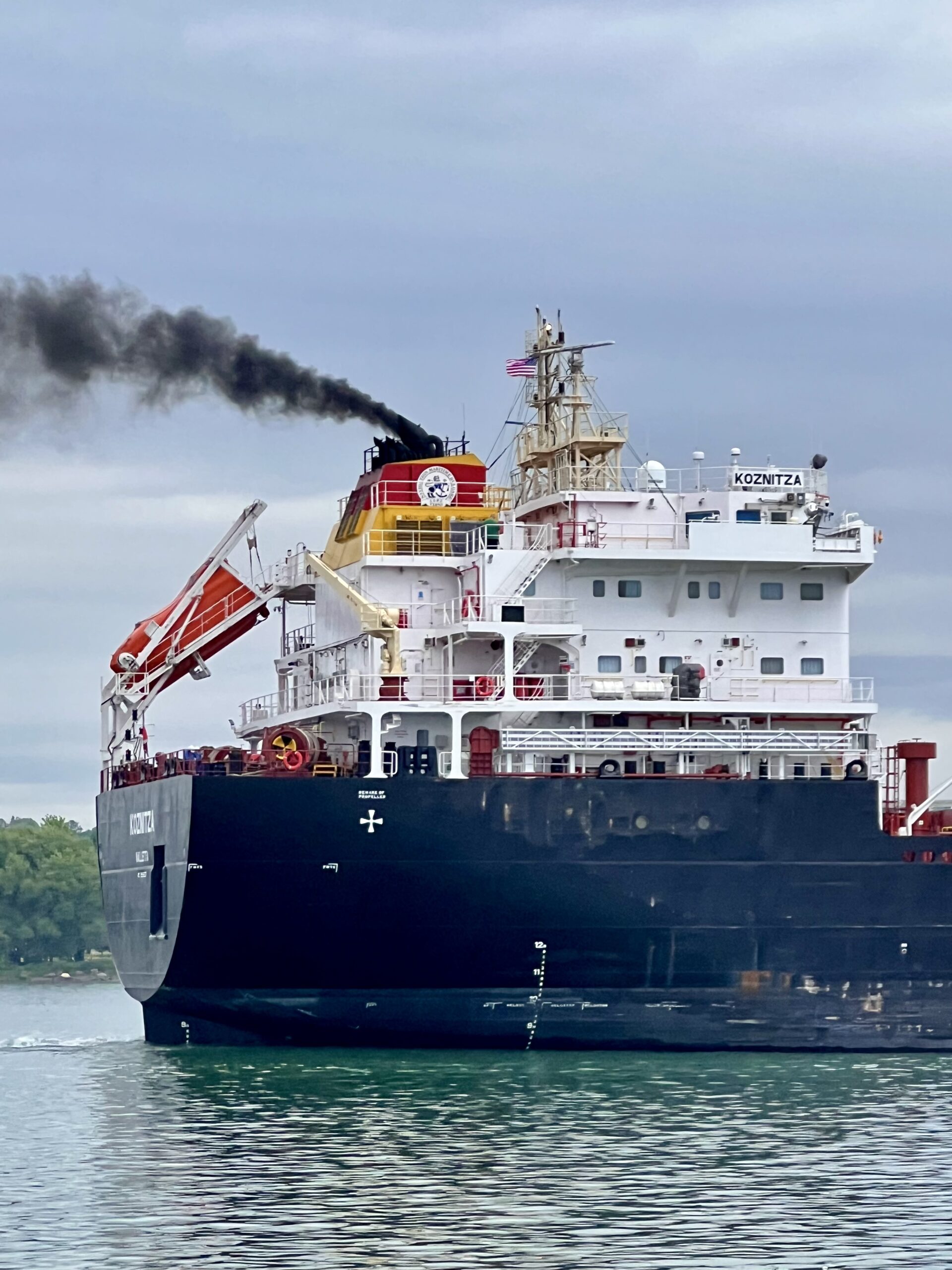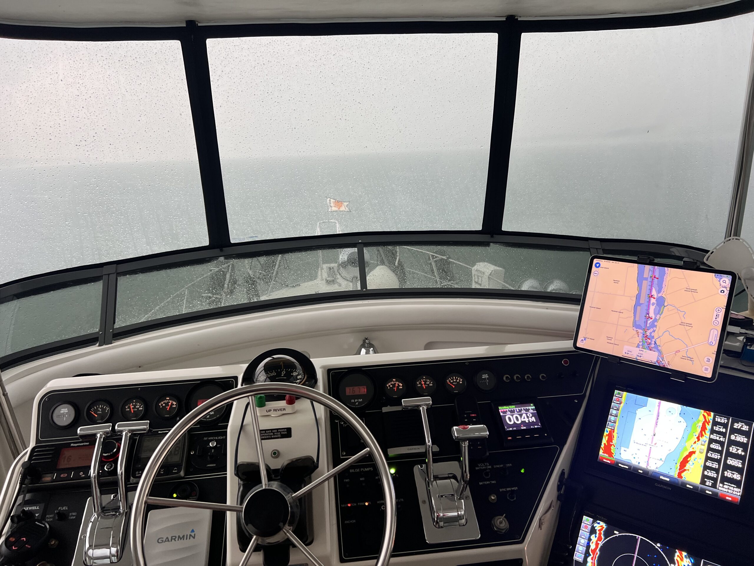 Then over the radio we heard what no boater wants to hear in a storm, or really any time. “Now or Never, Now or Never, this is the United States Coast Guard.” The captain acknowledged the call and the coast guard continued “you are navigating up the downbound channel and there is a 700 footer coming your way – just a couple of miles out”. Yikes! Captain Dave responded, “we will turn around immediately”. While recreational craft are not bound by channel directions and we were fully legal nobody wants to play chicken with a downbound freighter especially in a storm with limited visibility. Our radar was inundated by the passing storm clouds and heavy rain that was turning our radar solid red all around us and their AIS signal wasn’t being observed.