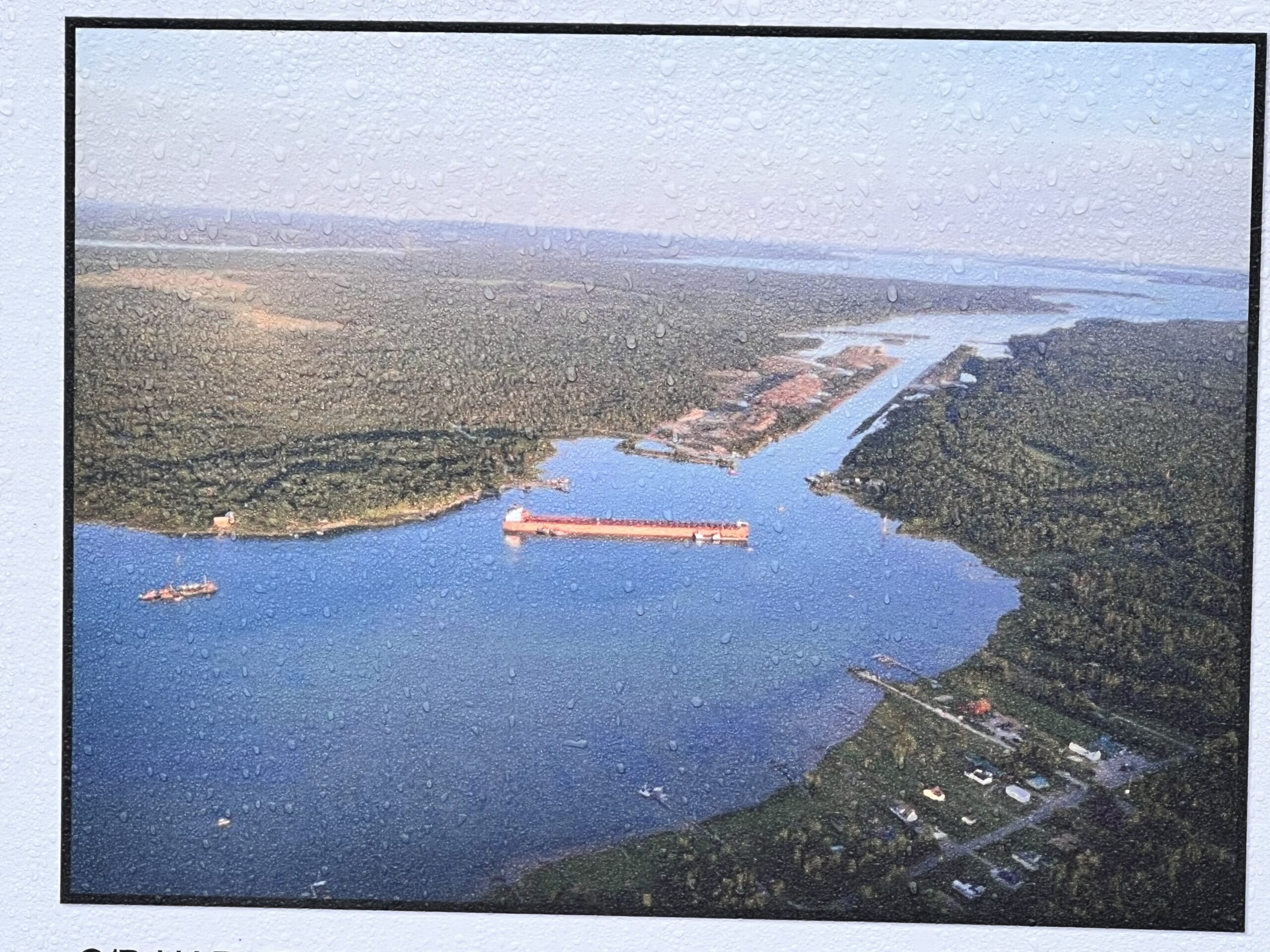 Photo on left is from a brochure starting on left MacArthur Lock, Poe Lock, and construction of new lock. Photo on right, we took as a freighter was entering lock – tight squeeze!