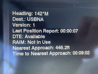As shown below a “Digital Yacht” brand Class B transducer shares Now or Never’s location, speed, direction and status to other vessels which enhances safety. All equipped vessels in the area will be alerted when we in the area and when and if we are on a collision course. This is very handy because on narrow passages such as a river or channel or even a busy harbor you can determine how you are going to react to each situation and know their name to hail them on the radio. In the photos below you can see the tow boat Steven E Furlong traveling down the Cumberland River. At the time of these photos we were in our dock located up the small creek that you see at the top of of the waterway. We are 7/10ths of a mile away and behind a wall of trees yet we can know of his presence. The other associated screens show his identifying information, his size (big 42 meters long by 11 meters wide) that he is .7 miles away and approaching our general area. He is traveling 4.4 mph and that since I am tied to a dock and not moving that he will be 446′ away from me when he passes in 9 minutes and 2 seconds. An alarm will sound and his icon on the screen will turn to bright red when he comes within 2500′ of me. Pretty handy huh?